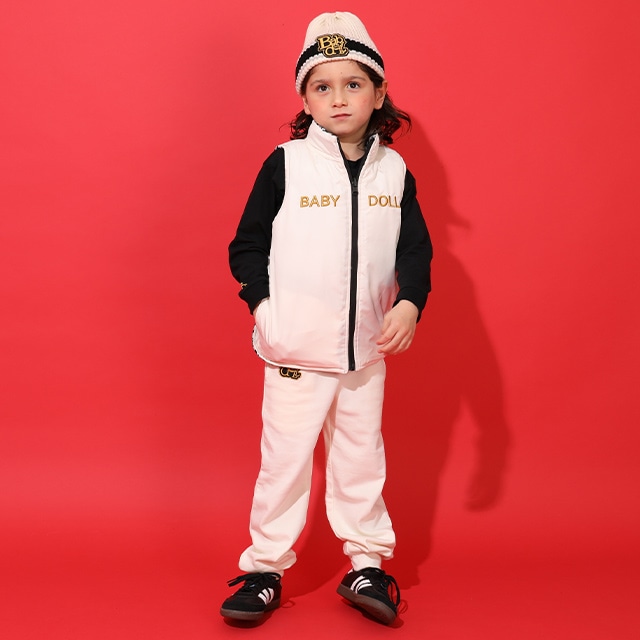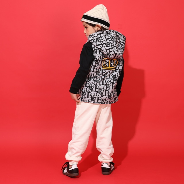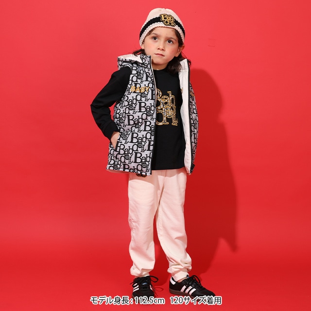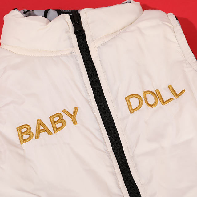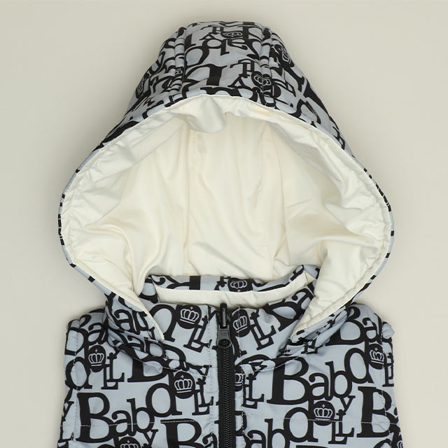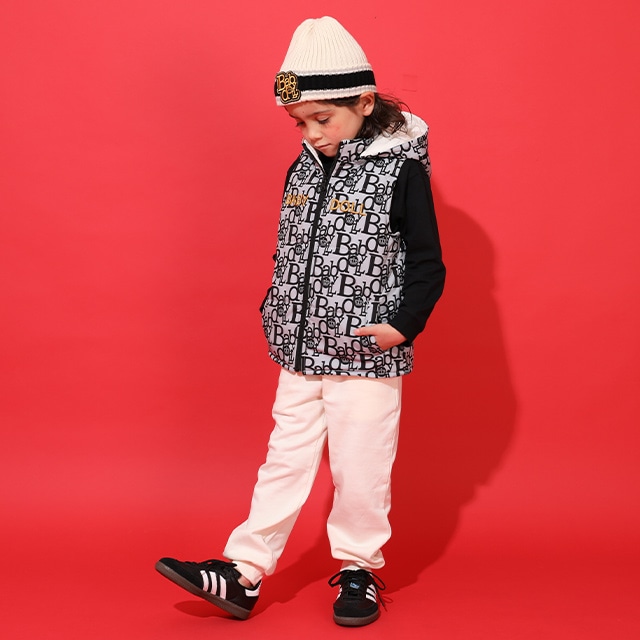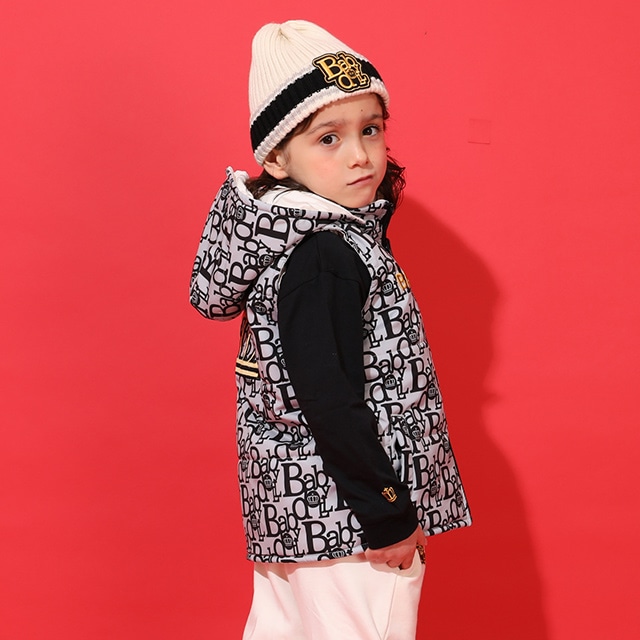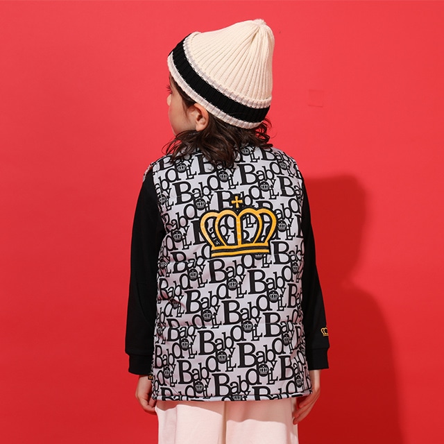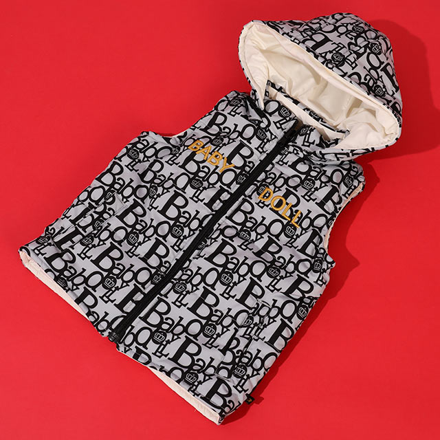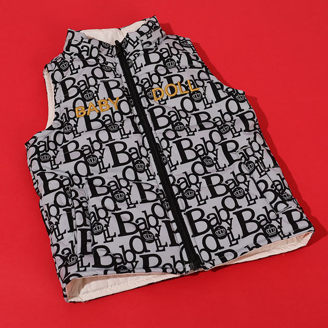 ロゴの総柄と刺しゅうのデザインが豪華な中綿入りベスト。