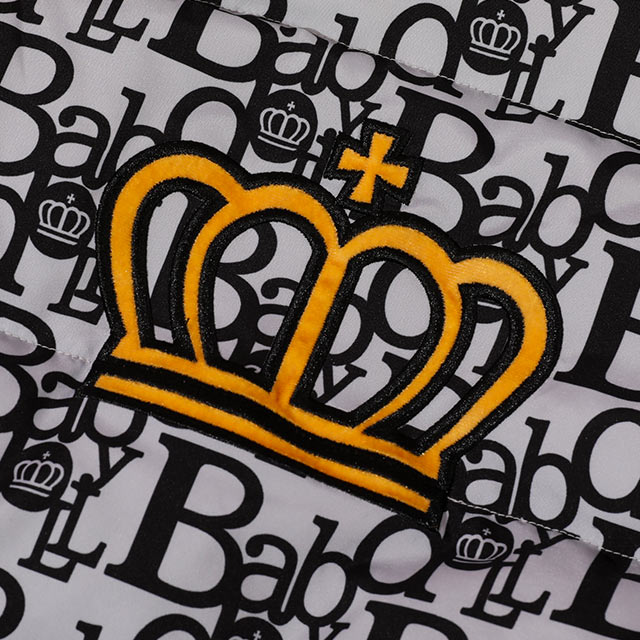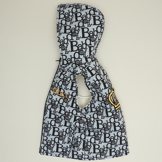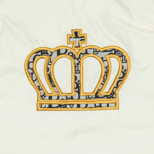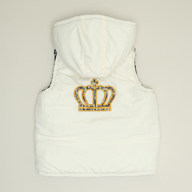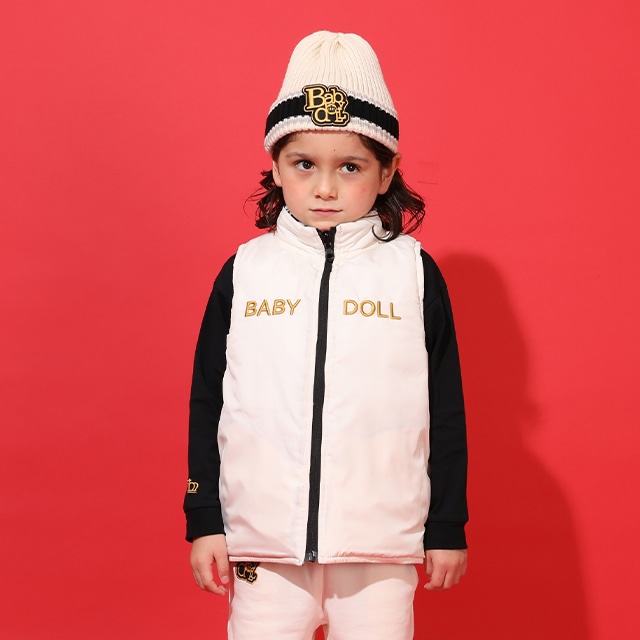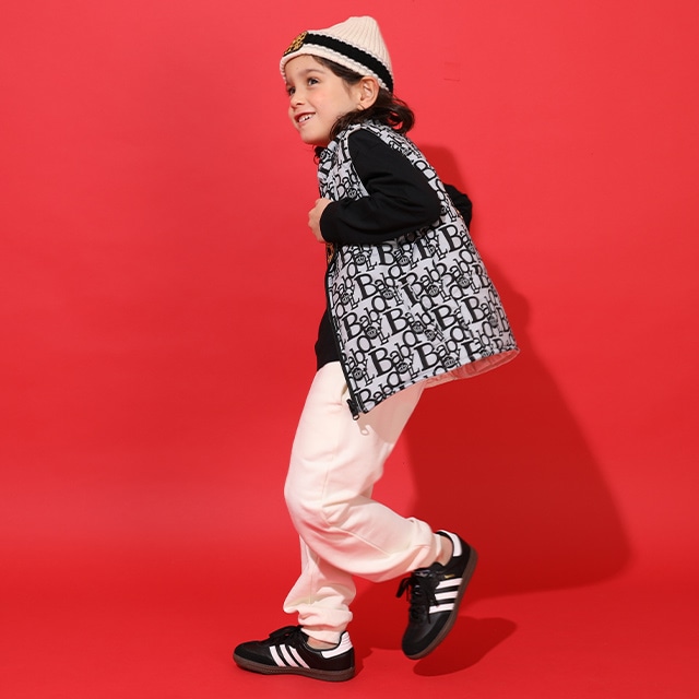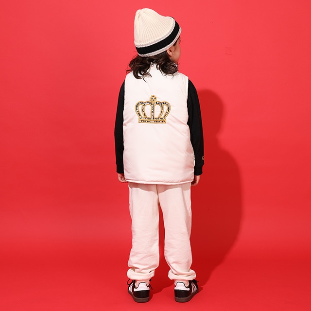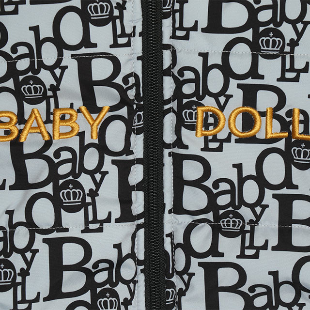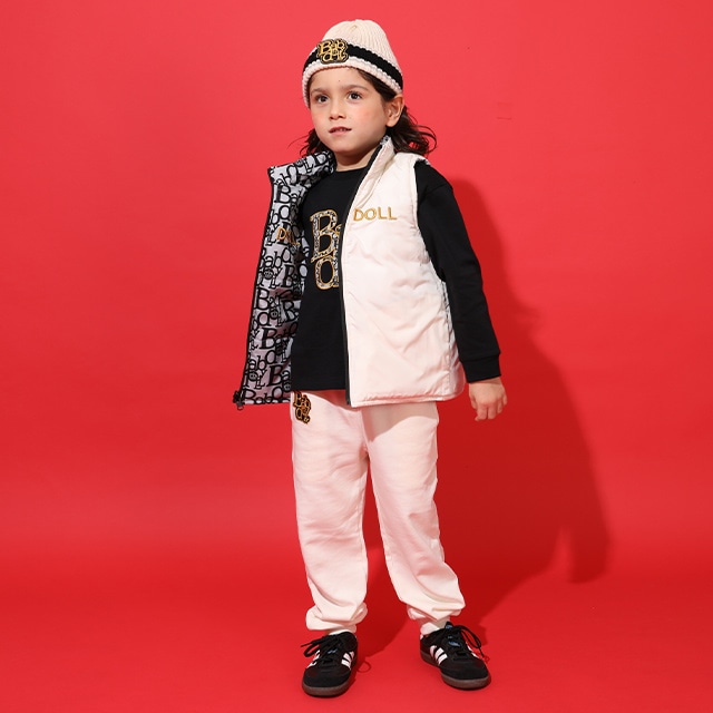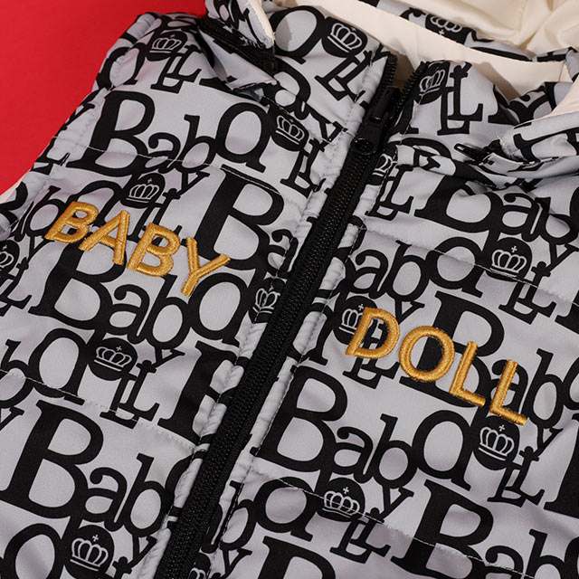 ロゴの総柄と刺しゅうのデザインが豪華な中綿入りベスト。