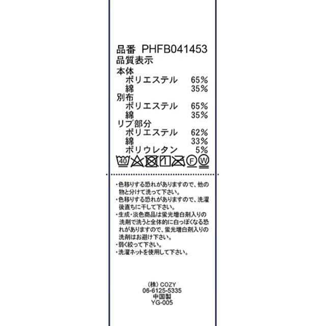 リブ部分:ポリエステル62%,綿33%,ポリウレタン5%