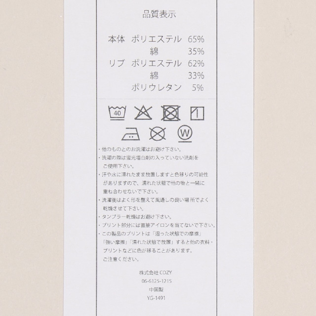 リブ部分:ポリエステル62%,綿33%,ポリウレタン5%