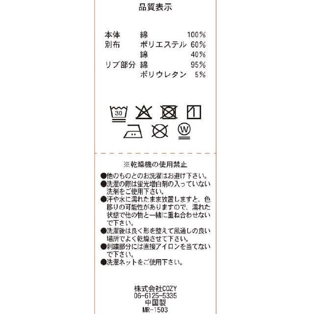 別布:ポリエステル60%,綿40%リブ部分:綿95%,ポリウレタン5%