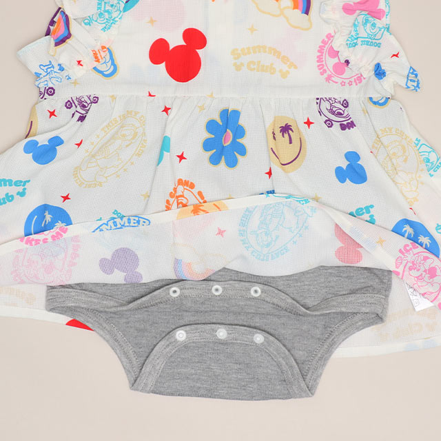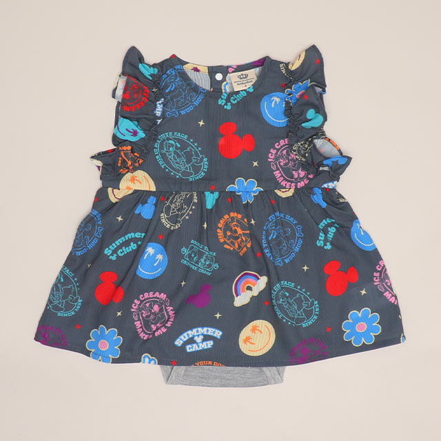 ポップなアイコンの総柄デザインが目を惹くワンピースタイプのロンパース♪